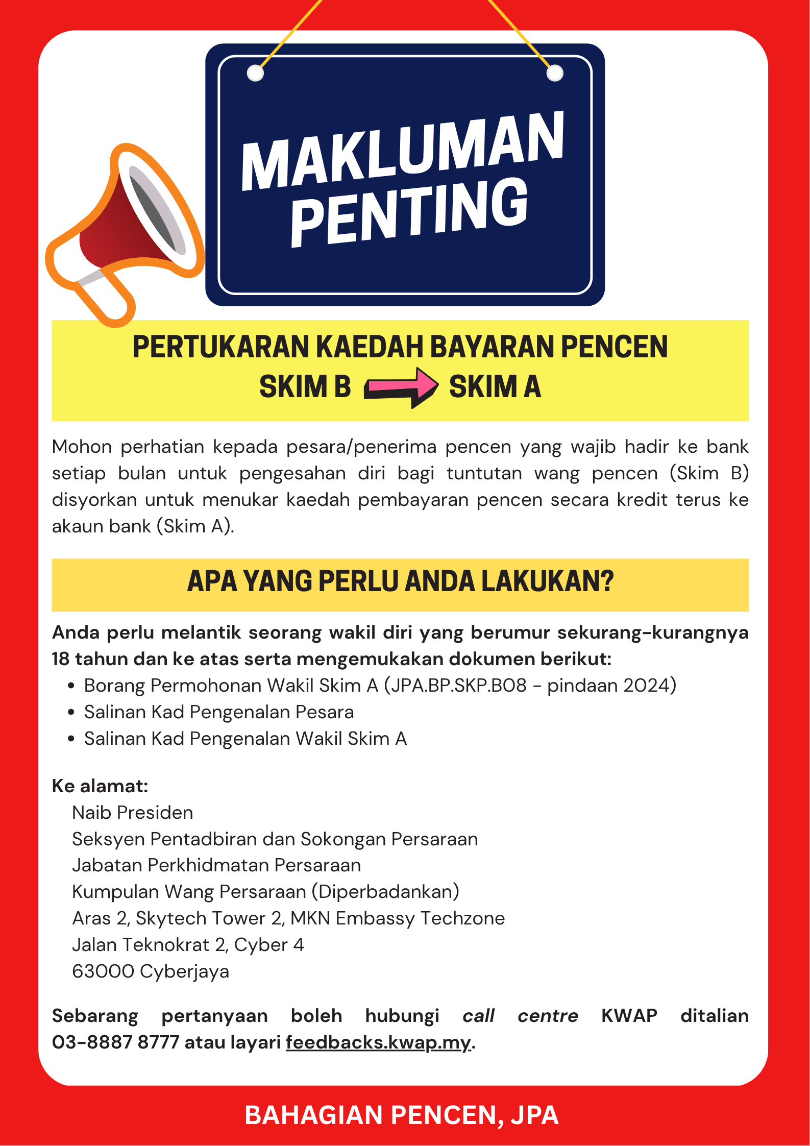 Pertanyaan tentang maklumat berkaitan dengan pencen dan pertanyaan lain boleh diajukan kepada mypesara@kwap.okie.my atau the MyPesara care line di +603 8887 8777.